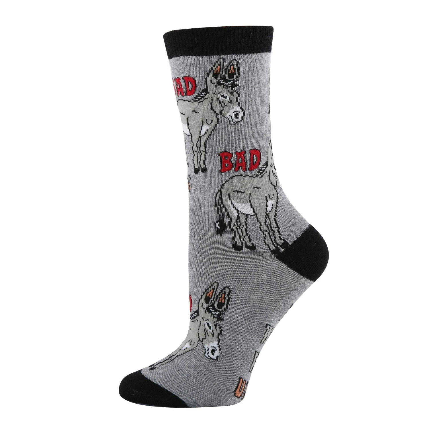 This pair of mid-calf crew length novelty donkey socks come in one size that fits most women’s feet. Made of 65% Combed Cotton, 32% Nylon, 3% Spandex. We have the same design also available in a larger men’s size which you can find here:Â Men’s Bad Ass Socks