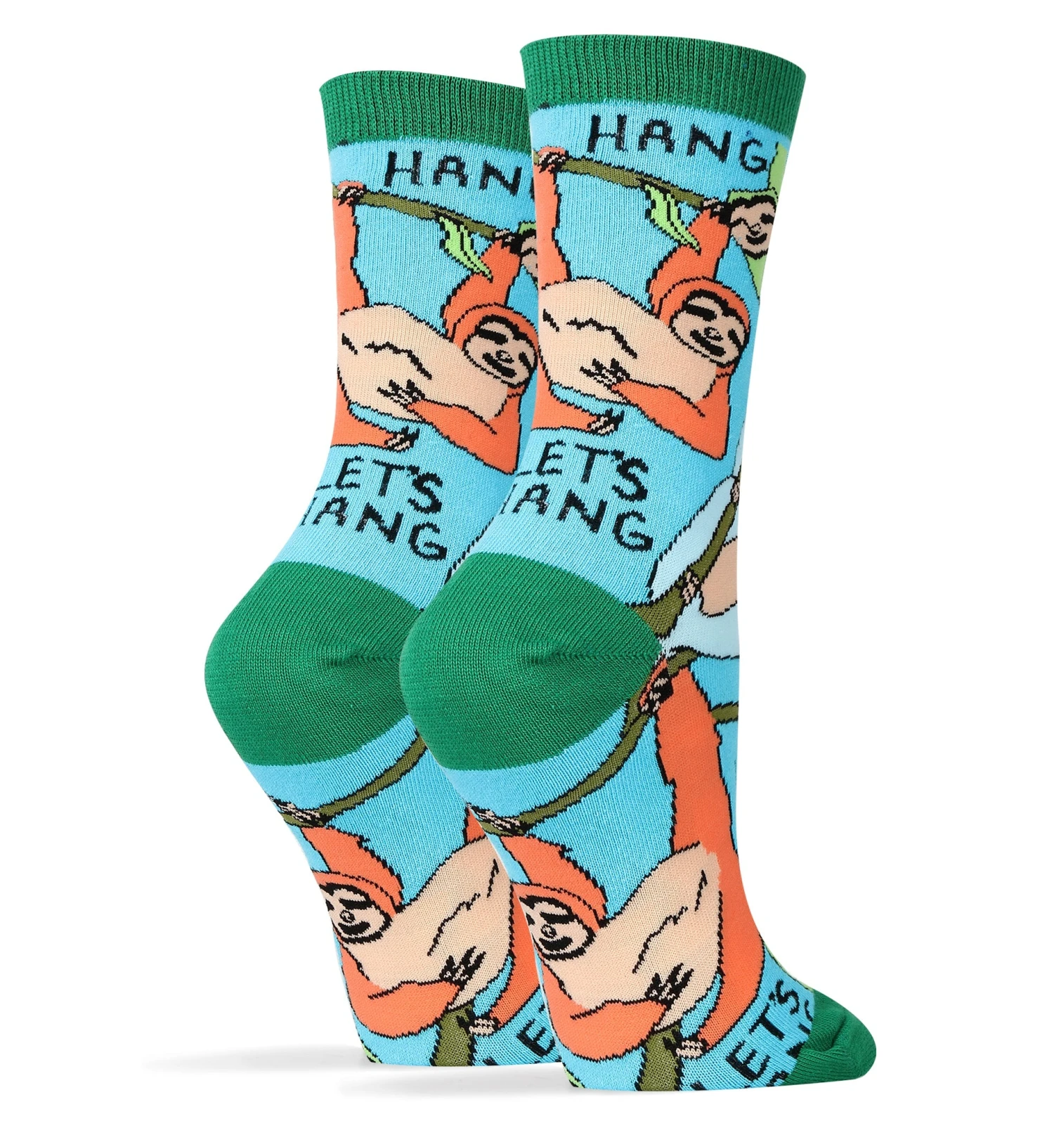 This pair of mid-calf crew length novelty socks come in one size that fits most women’s feet. Made of 65% Combed Cotton, 32% Nylon, 3% Spandex. We have the same design also available in a larger men’s size which you can find here: Men’s Let’s Hang Socks