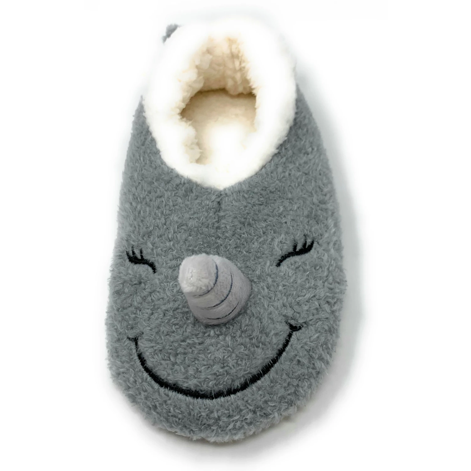 Stay warm & look great with your new narwhal themed grey & white sherpa slippers. Wear them around the house or out and about thanks to the non-skid rubber bottom. Pick up a pair today!