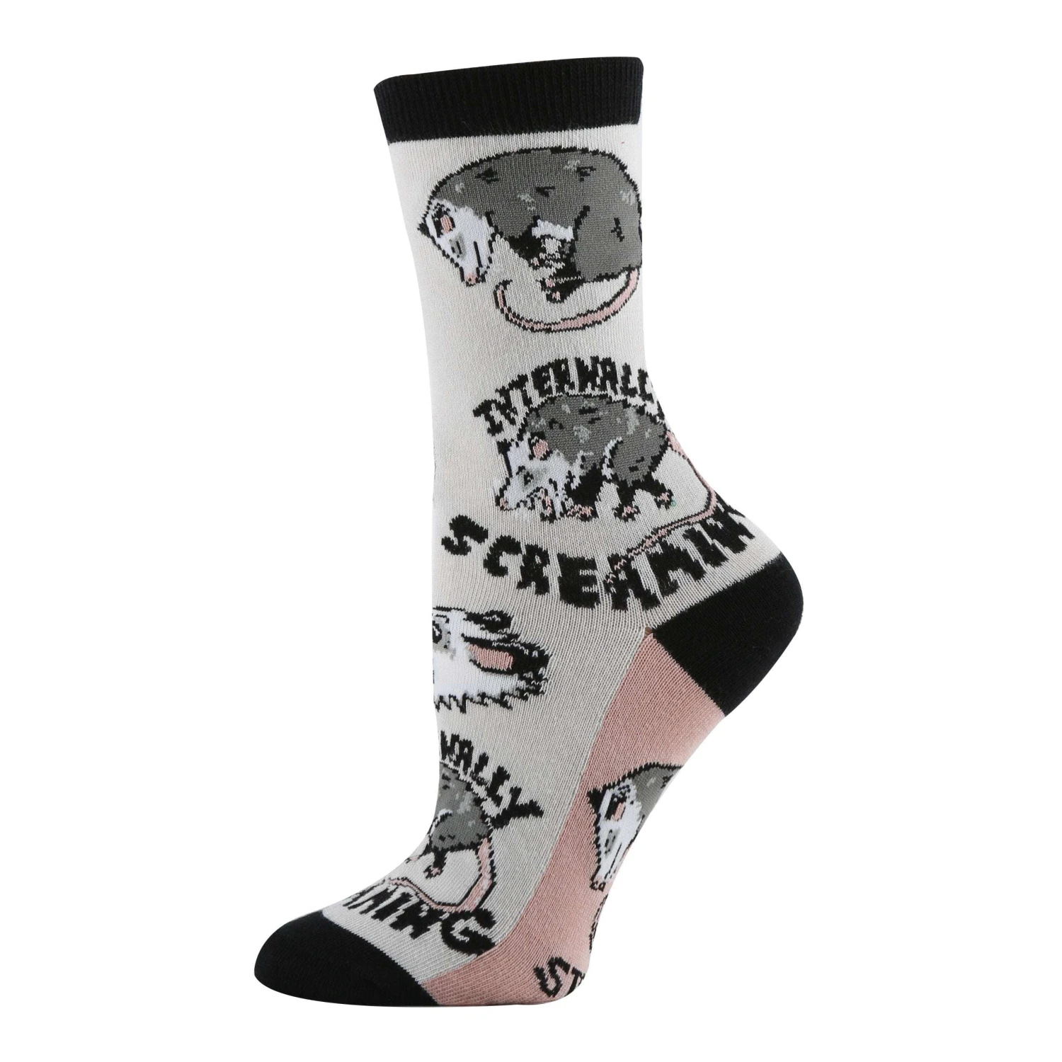 This pair of mid-calf crew length novelty socks come in one size that fits most women’s feet. Made of 65% Combed Cotton, 32% Nylon, 3% Spandex. We have the same design also available in a larger men’s size which you can find here: Men’s Stressed Opossum Socks