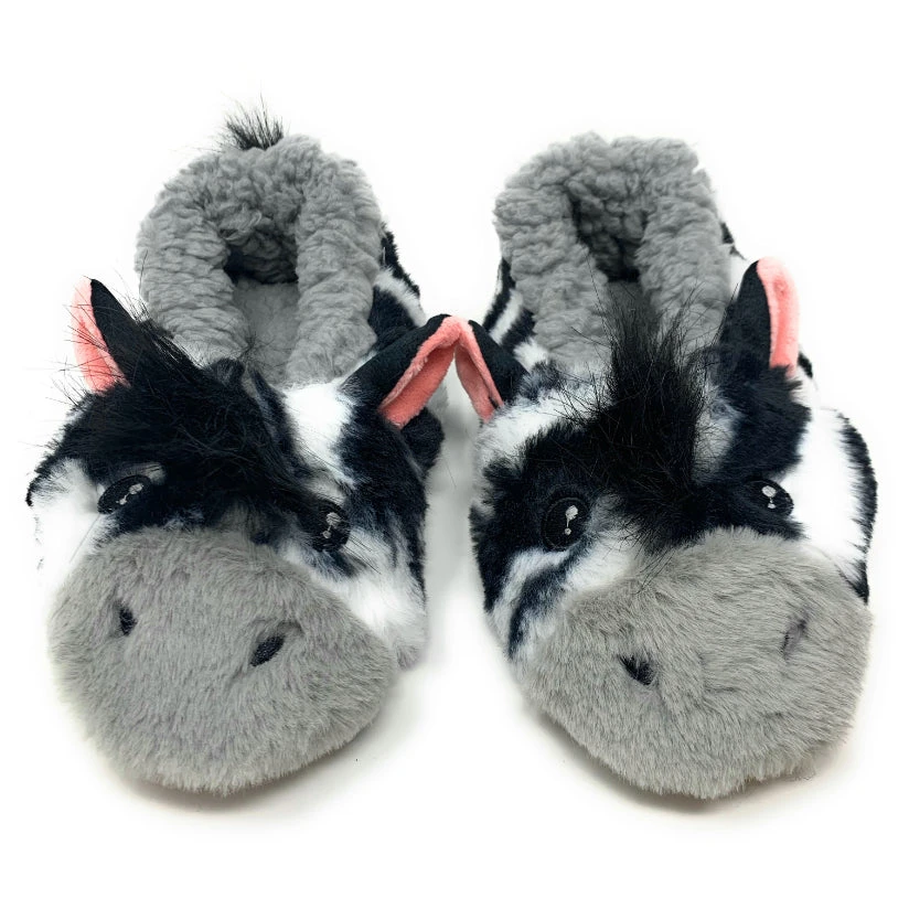 Stay warm & look great with your new zebra themed grey fuzzy slippers. Wear them around the house or out and about thanks to the non-skid rubber bottom. Pick up a pair today!